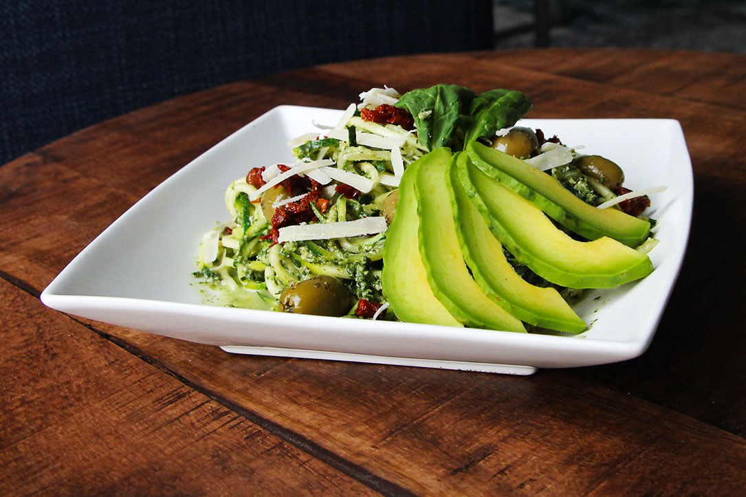 - Serveer op een bord en voeg de olijven, tomaten, avocado en verse basilicum toe. Eet smakelijk!